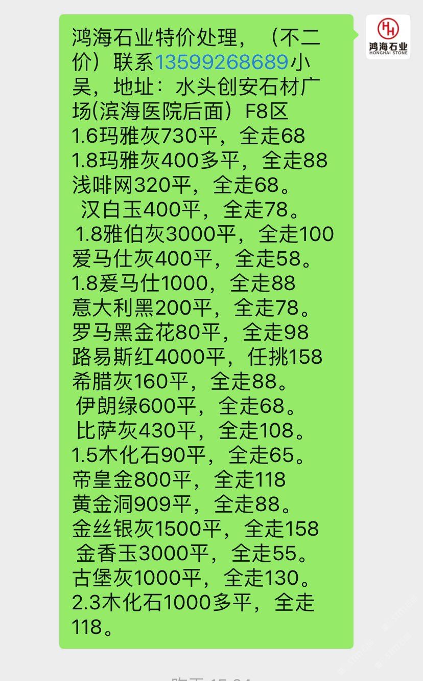 鴻海石業(yè)-現(xiàn)板5萬平特價處理,(不二價)聯(lián)系13599268689小吳,地址:水頭創(chuàng)安石材廣場(濱海醫(yī)院后面)F8區(qū) 1.8絲綢白3000平,150起 1.8金絲銀灰7500平,100起1.8夢幻藍(lán)4500平,100起。1.8卡拉垃白一150元起。 1.8藍(lán)色星球1300平,150起水墨年華6000平全走78。 1.8午夜星河1300平,150起1.8多蘭戈(紅色)300平,柏斯高灰2000平,全走88 新瑪雅灰3500平,全走88 1.5瑪雅灰200多平,全走68 星塵灰400平,全走88。 愛馬仕灰7500平,全走78 羅馬黑金花60平,全走88 黃金洞909平,全走88。 金香玉300平,全走50。 古堡灰1000平,全走99。 云?;?00多平全走128。2.3木化石100平,全走128。