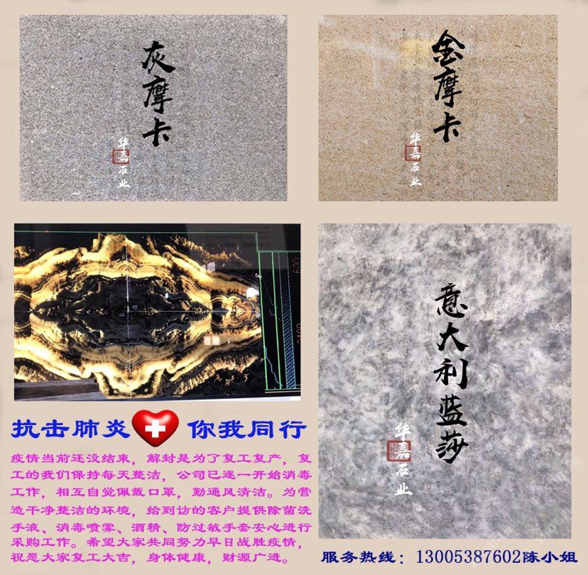 公司以代理土耳其/意大利等國(guó)的新型石材為優(yōu)勢(shì),主營(yíng)水墨玉/清水玉、歐典米黃/新莎安娜米黃、古堡灰/云多拉灰、法國(guó)米黃、伊麗莎白、皓月木紋、白玉蘭等大理石荒料及板材;承接各類大中型工。建立以六都港作為物流集散中心輻射全國(guó)各大港口、內(nèi)陸/港澳臺(tái)地區(qū)的運(yùn)輸網(wǎng)絡(luò),建成天然石板材生產(chǎn)線三條,擁有自動(dòng)烘爐聚酯補(bǔ)板線一套,全自動(dòng)板材晶光拋磨線一條,年產(chǎn)天然石板材500萬平方米,產(chǎn)品遠(yuǎn)銷國(guó)內(nèi)外市場(chǎng)。\