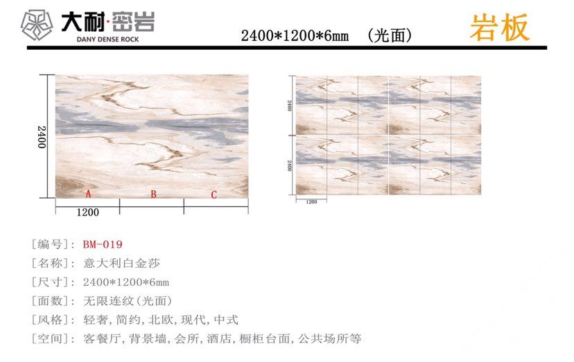 新品種:巖板,硬度坑比石英石,亮度高,耐磨耐刮,防火防高溫,零滲透極耐污,超耐腐蝕,無毒無輻射。