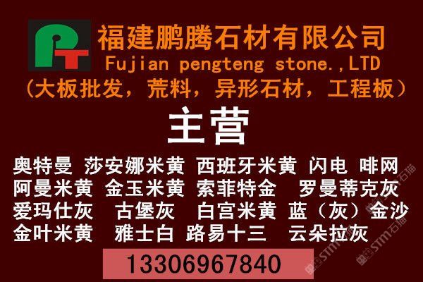 【鵬騰石業(yè)】專業(yè)加工出口超薄板材和超寬大板,并且在國內(nèi)外各大石材市場設(shè)有經(jīng)銷部和分公司,專業(yè)批發(fā)各種 大理石大板、花崗巖大板,并承接國內(nèi)外石材工程。