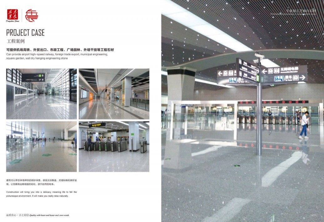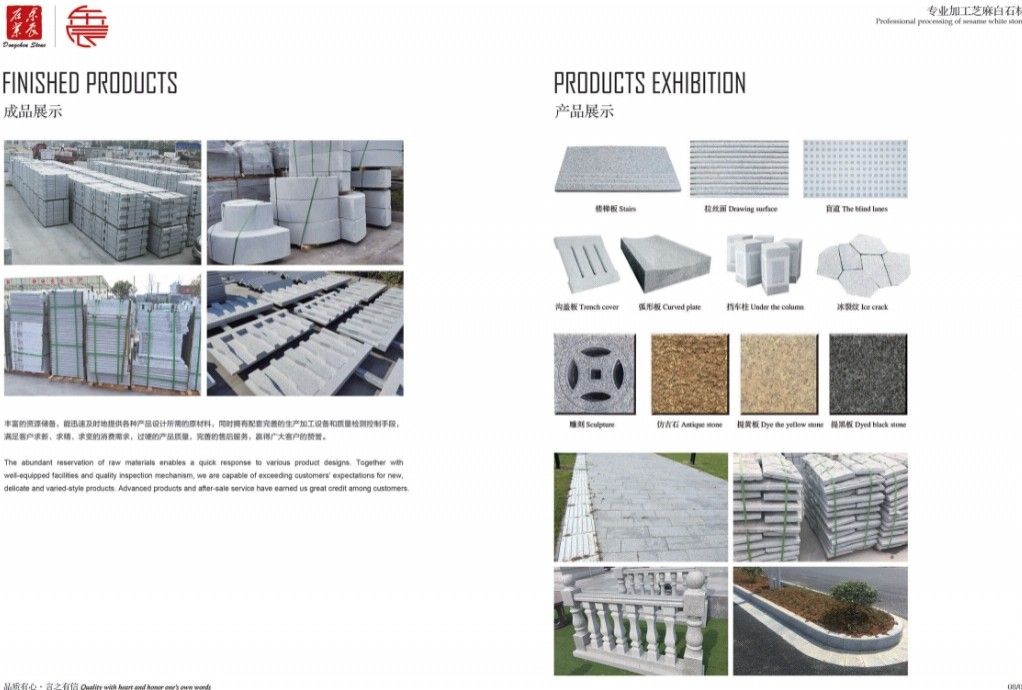 主營:承接高鐵機(jī)場、外墻干掛、廣場別墅、市政工程和外貿(mào)出口等各種工程板。 主營芝麻白G603、芙蓉白G602火燒面、光面、荔枝面、斧剁面、噴砂面、拉絲面、菠蘿面,水溝蓋板、雕刻板、路沿石、蘑菇石、擋車石、馬蹄石、冰裂紋、圓球、染色板等