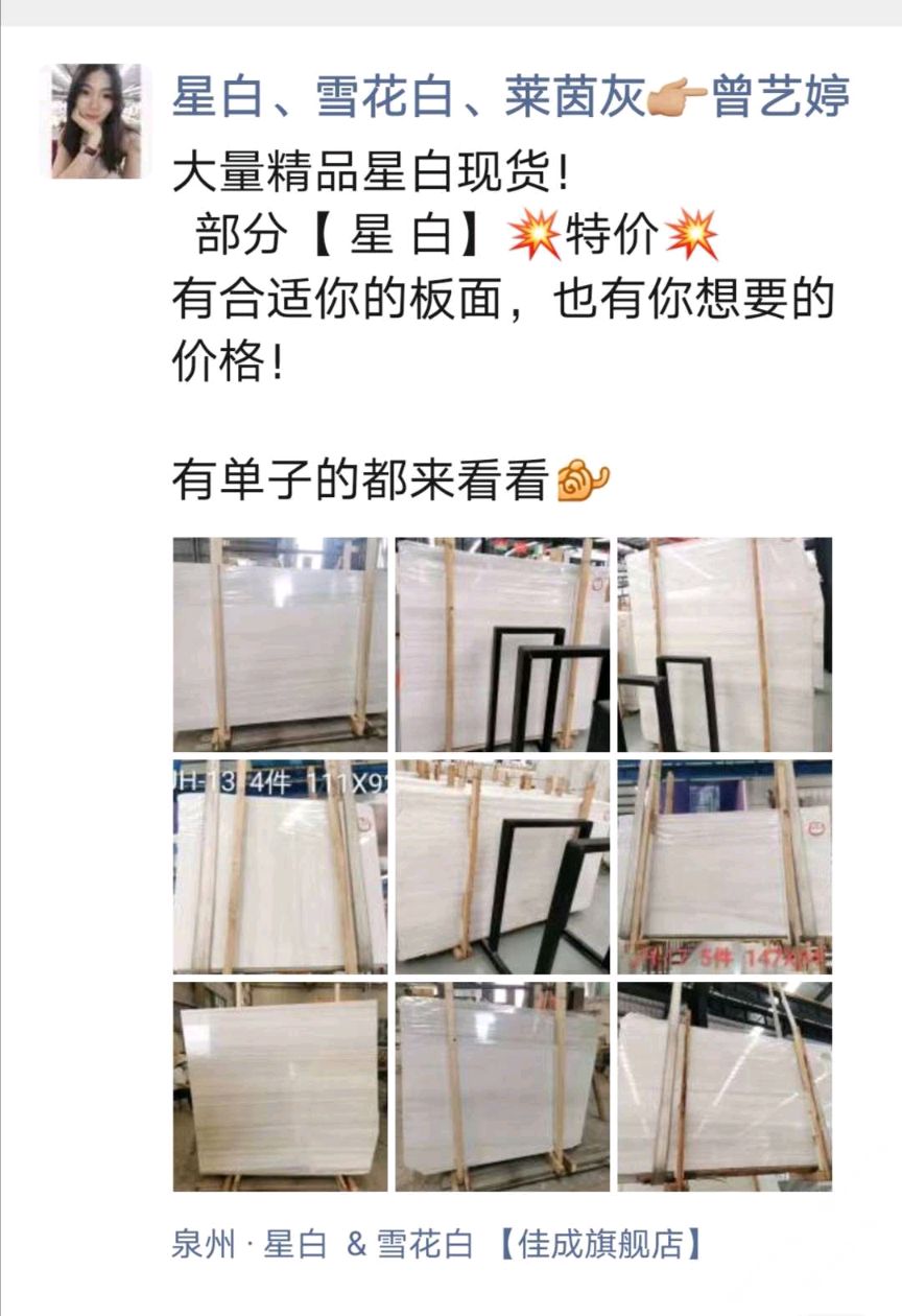 發(fā)布信息: 大量精品星白現(xiàn)貨! 部分【 星 白】??特價(jià)?? 有合適你的板面,也有你想要的價(jià)格! 有單子的都來(lái)看看 ?13655908749曾 地址:南翼石材城三號(hào)門(mén)四號(hào)倉(cāng)三區(qū)