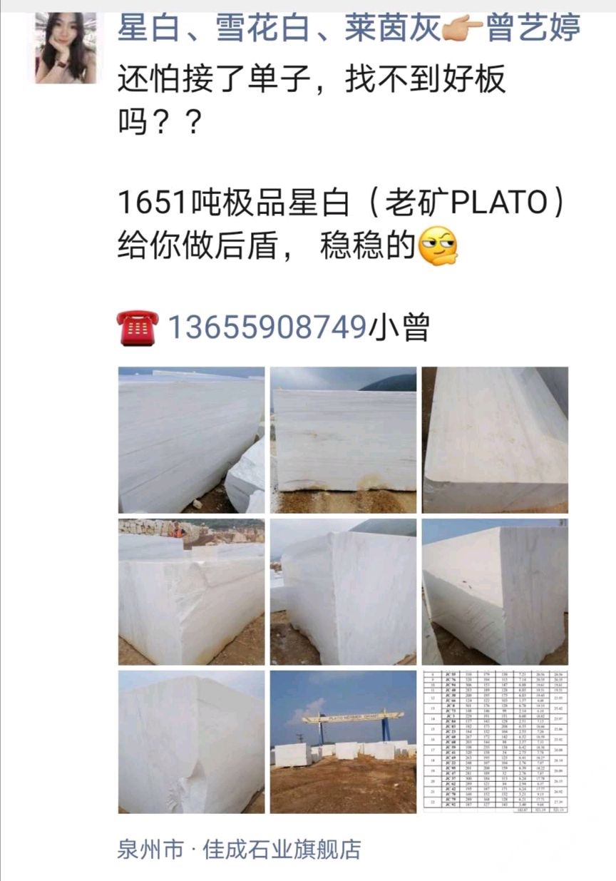 發(fā)布信息: 大量現(xiàn)貨,老礦PLATO星白1651噸, 荒料可賣,可單挑,可訂切! 聯(lián)系電話:13860761011呂