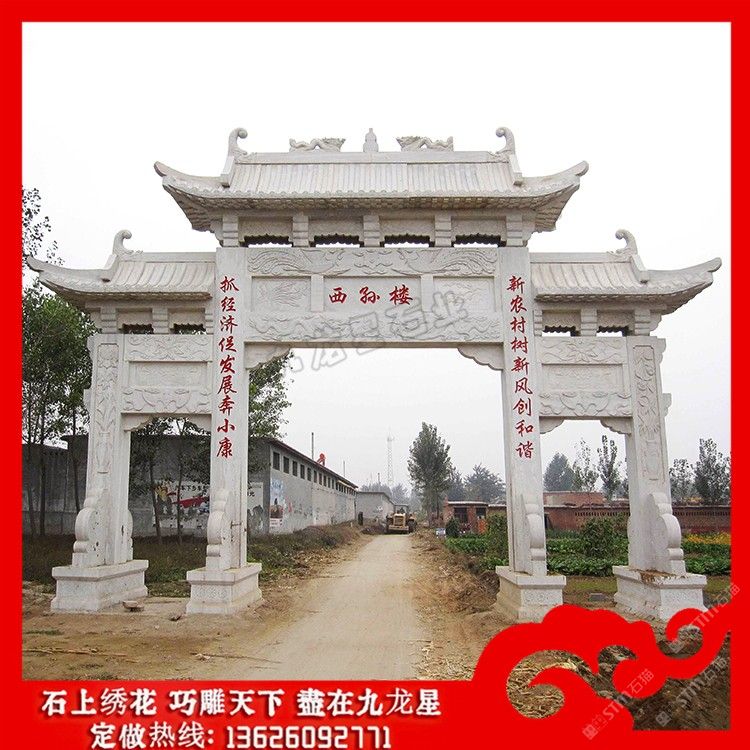 發(fā)布信息: 石牌坊制做廠家 鄉(xiāng)村牌坊大門效果圖大全賞析——九龍星石業(yè)。 鄉(xiāng)村牌坊大門效果圖具有相當(dāng)高的實(shí)用性的,從建筑的美觀上石牌坊是一個(gè)建筑的 代言,從文化上石牌坊是一個(gè)區(qū)域或一個(gè)地域或一個(gè)民族的文化修養(yǎng)代言,在使用性 上從小的來(lái)說(shuō)石牌坊可以做一個(gè)院落的大門,可以是一個(gè)街和它文化的開端。 石牌坊制做廠家在制作上其用料的選擇是非常講究的,在雕刻制作時(shí)也是要 求的比較的精致。而且美麗鄉(xiāng)村入口牌坊上都混雕刻有圖案和文字有著深厚的文化以 及當(dāng)?shù)氐拿耧L(fēng)民俗。在村指引牌坊圖片的制作過(guò)程中,每一座石牌坊都會(huì)采用陰刻、 線刻、浮雕、鏤雕、雙面雕等多種不同的雕刻手法,使新農(nóng)村石牌坊在雕刻制作上的 圖案更加的生動(dòng)。 鄉(xiāng)村牌坊大門在主題外觀和內(nèi)容雕刻上本身就是一種藝術(shù)的詮釋。比如在門樓 四個(gè)柱腳上制作瑞獸例如:麒麟、貔貅、瑞獅、瑞象、抱鼓等傳統(tǒng)的祥瑞圓雕雕刻。 也可以和諧的添加一些西方建筑經(jīng)典,在建筑藝術(shù)上它是不分界限的,我們?cè)诿利愢l(xiāng) 村入口牌坊外觀的設(shè)計(jì)制作上,可以有一些和諧的改造也是體現(xiàn)提倡建造者的文化修 養(yǎng)的表現(xiàn)。