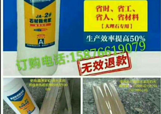 發(fā)布信息: 本產(chǎn)品(晶亮拋光漿1號(hào)):適合用于大理石、玉石表面拋光只需用手十布搓就能快速達(dá)到光度,全真光不用再打蠟!光度在室內(nèi)保持2到3年。 (晶亮拋光膏2號(hào):適合用于花崗、人造石,某些難以起光大理石等,使用方法需配合(3號(hào)拋光機(jī))振壓出才能出光度全真光不用再打蠟。室內(nèi)光度保持2到3年。室外光度日曬雨淋幾個(gè)月也沒(méi)問(wèn)題 本產(chǎn)品大量批發(fā),廠家直銷。熱線15876619079!