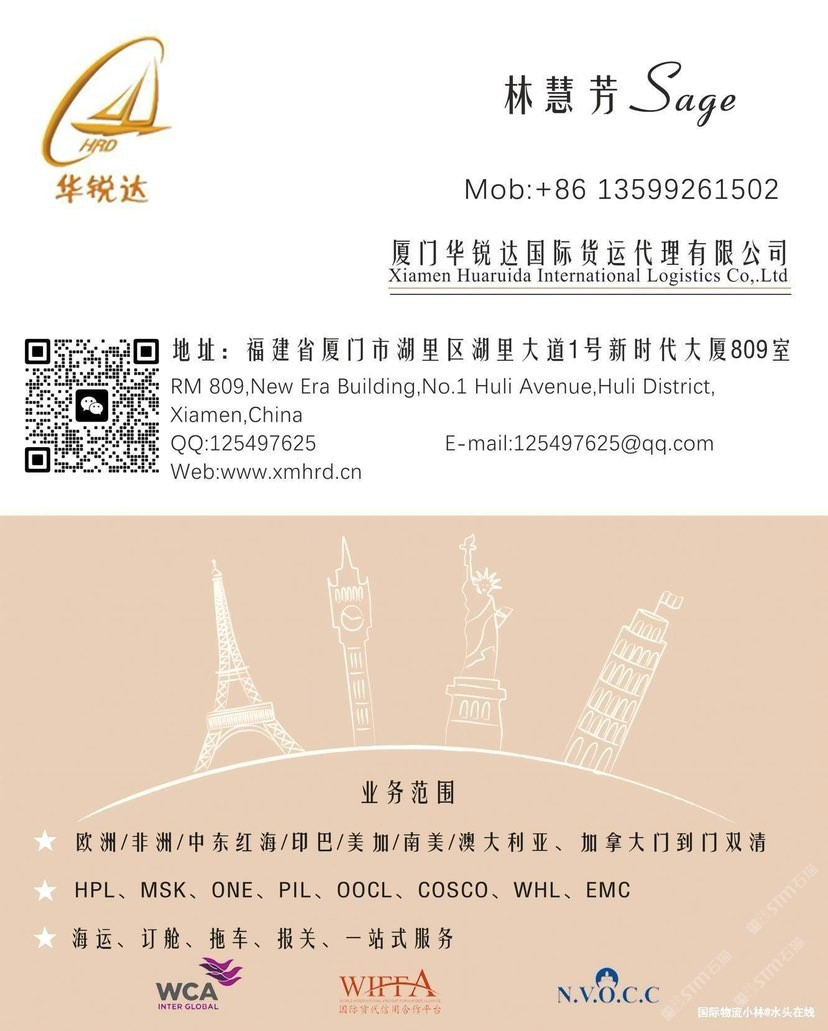 廈門(mén)華銳達(dá)國(guó)際物流有限公司 聯(lián)系人:林慧芳    135****1502 查看 135****1502 查看 主營(yíng)范圍: 物流、 企業(yè)地址:福建廈門(mén)廈門(mén)湖里區(qū)湖里大道1號(hào)新時(shí)代大廈8樓809室