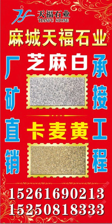 發(fā)布信息: 天福石業(yè)【主營經(jīng)營】芝麻白(603#)、卡麥黃.602#.芝麻灰、銹石、黃金麻、卡拉麥里金·毛板、光板、火燒板,荔枝面成品板及臺階石、蘑菇石~路沿石、擋車石,圓球.圓柱.異形、仿形加工工藝品等。適合用于各種場合, 優(yōu)質(zhì)礦山資源以質(zhì)量求生存、以信譽求發(fā)展。聯(lián)系電話:15250818333