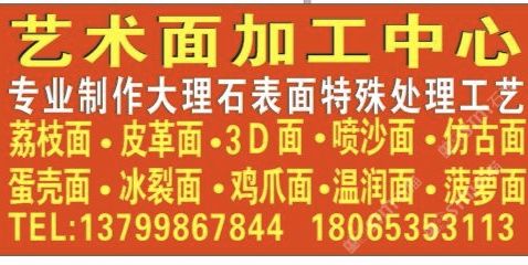 發(fā)布信息: 專業(yè)加工大理石荔枝面,拉絲面,3D面,皮革面,噴砂面,蛋殼面,雞爪面,冰裂面,菠蘿面,溫潤面,仿古面,聯(lián)系電話18065353113,