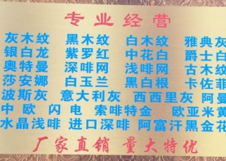 喜石多主營產(chǎn)品:范特西,巴拿馬木紋,格陵蘭灰,雅仕灰,云朵拉灰,威尼斯金,奧斯汀灰,卡慕灰,麥卡灰,月亮云灰,布拉格灰,尼泊爾灰,范思哲灰,布朗啡,索菲特金,日出印象,圣托里尼灰,西西里灰,城堡灰企業(yè)地址:福建南安水頭鎮(zhèn)遠(yuǎn)達(dá)石材城H8區(qū)喜石多