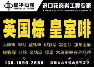 福建省南安市峰華石材有限公司主營(yíng)產(chǎn)品:安哥拉黑,英國(guó)棕,大啡珠,加州金麻,綠星,木瑪麗,樹(shù)掛冰花,蝴蝶綠,紅鉆,高蛟紅,銀珠3,啡鉆(白底),南非紅,鐵灰,皇室啡,駱駝棕,巴西金麻,啡鉆,金鉆麻,墨綠麻,幻彩紫,黑金沙,加州金麻(黑底),加州金麻1,英國(guó)棕1,英國(guó)棕3,英國(guó)棕2,英國(guó)棕(4號(hào)礦),英國(guó)棕(澳凱礦 黑底),英國(guó)棕(紅),英國(guó)棕(澳凱礦),英國(guó)棕HL礦,安哥拉黑(黑水晶),安哥拉黑鉆,黑水晶,美國(guó)白麻,芭蕉黃,美國(guó)灰麻,巴西金,幻彩紅,皇室啡3,皇室啡5,皇室啡(荔枝面),皇室啡(火燒面),皇室啡2,皇室啡-1,金鉆麻(巴西),金山麻,金山麻1,金山麻(巴西),白玫瑰(巴西),白玫瑰(花崗巖),白玫瑰3,墨綠麻(巴西),駱駝棕1,綠星1,黑金沙(中花),黑金沙(中細(xì)花),皇室啡1,銀珠,英國(guó)棕(老礦),英國(guó)棕(黑底),英國(guó)棕KR礦,英國(guó)棕(老棕),英國(guó)棕KL礦,英國(guó)棕(黑紅),英國(guó)棕(DX礦),英國(guó)棕(淺紅)企業(yè)地址:福建南安水頭后房工業(yè)區(qū)